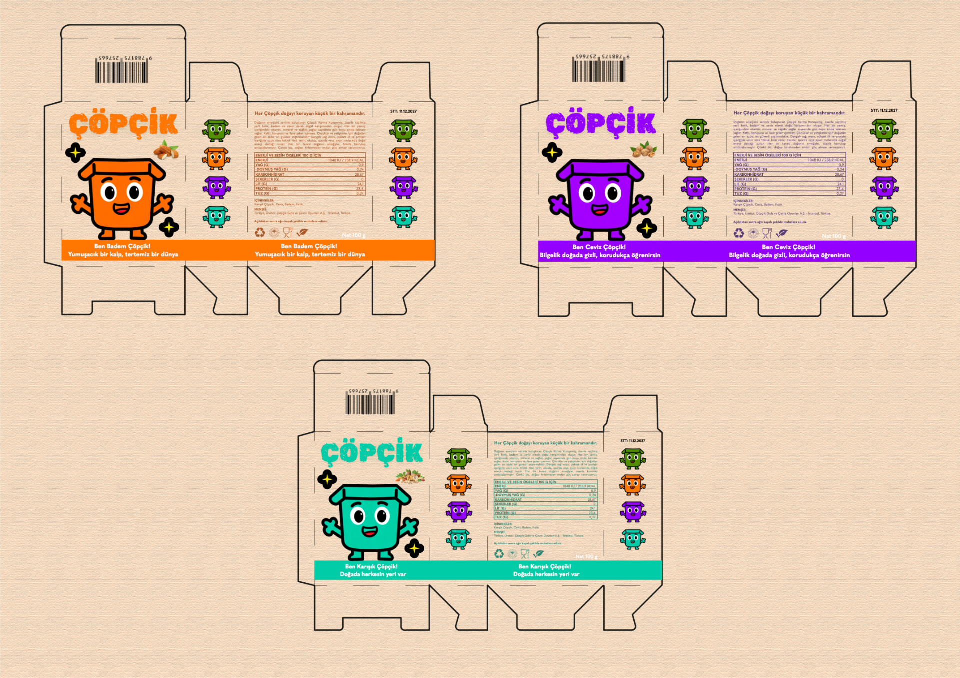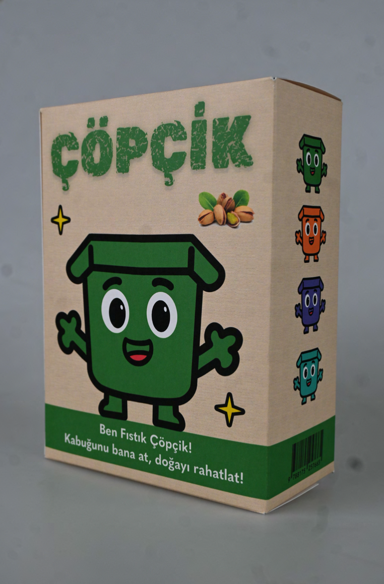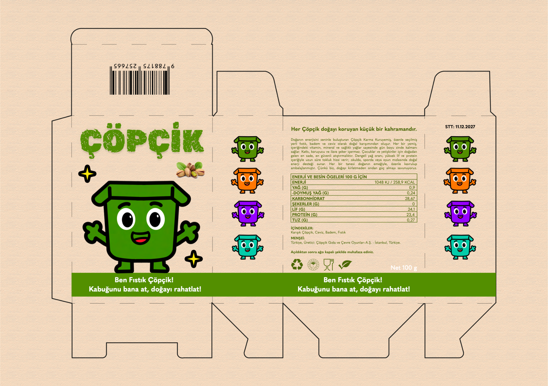 Çöpçik, çocuklara ve yetişkinlere yönelik sağlıklı kuruyemiş karışımlarını eğlenceli bir marka diliyle sunmayı amaçlayan bir ambalaj tasarımı projesidir. Projenin temel fikri, her bir kuruyemiş türünü "doğayı koruyan küçük bir kahraman" olarak konumlandırmak ve sürdürülebilirlik mesajını ürünün merkezine yerleştirmektir.